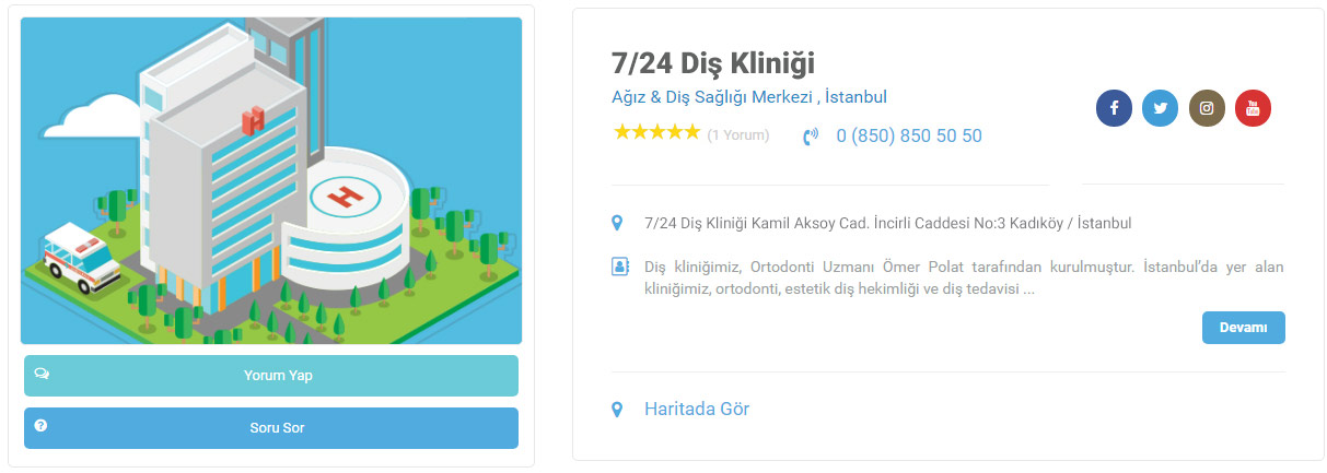 Özel profil sayfanız kurumunuza ait adres ve telefon gibi iletişim bilgilerini, kurumsal web sitesini, kurumunuza ait sosyal medya hesaplarını, kurumunuzda çalışan uzmanları, kurumunuzda bulunan tıbbi bölümleri, üniteleri ve kurumunuzda uygulanan tıbbi işlemleri içerir. Böylece hastalarınız hastanenize daha kolay bir şekilde ulaşır…